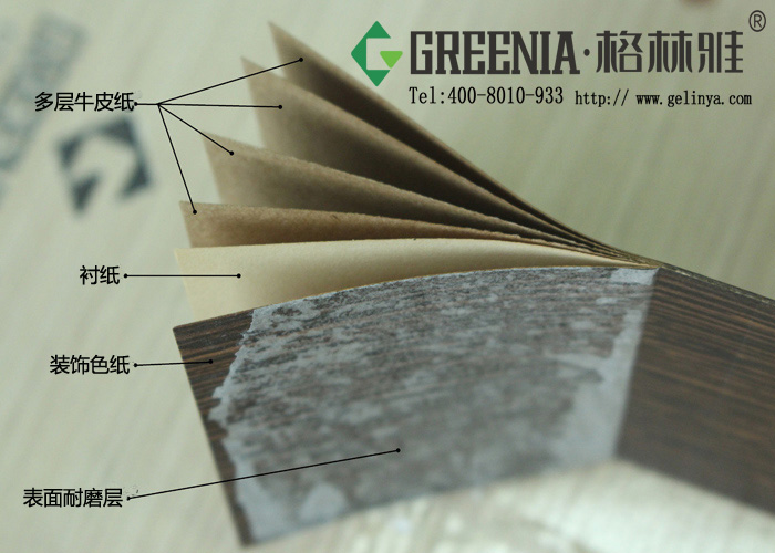 防火貼麵板,一般是由表層紙、色紙、基紙(多層牛皮紙)三層構成的。表層紙與色紙經過三聚氰氨樹脂成分浸染,使耐火板具有耐磨、耐劃等物理性能。多層牛皮紙使耐火板具有良好的抗衝擊性、柔韌性。