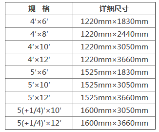 抗倍特板由於采用多層紙疊壓的工藝製作,所以板材厚度在廠家這邊並沒有太過嚴格的規定,基本可以按照草莓视频网站入口的需求來確定,市場上一般的抗倍特板厚度在1.6mm-25mm之間,如果有特殊要求需要在此基礎上更薄或者更厚也無不可,抗倍特板的大小尺寸由於受機器限製主要有一下九種大小尺寸可供選擇: