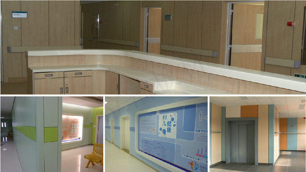掛牆板的應用很廣泛,例如,最常遇見的醫院,快餐店,地鐵站,這些人流密集的地方,都會用到這種材料。掛牆板實則為抗倍特板,但是一般比抗倍特板有著更豐富的特殊優點,是由多層含浸三聚氰胺和酚醛樹脂的牛皮紙經過高溫高壓製成,還可加上表麵色紙,使其滿足顏色需求。厚度可以根據需求,從1.6-25mm厚度,可以作為裝飾材料,也可以作為結構材料,及其的耐衝擊的特性。