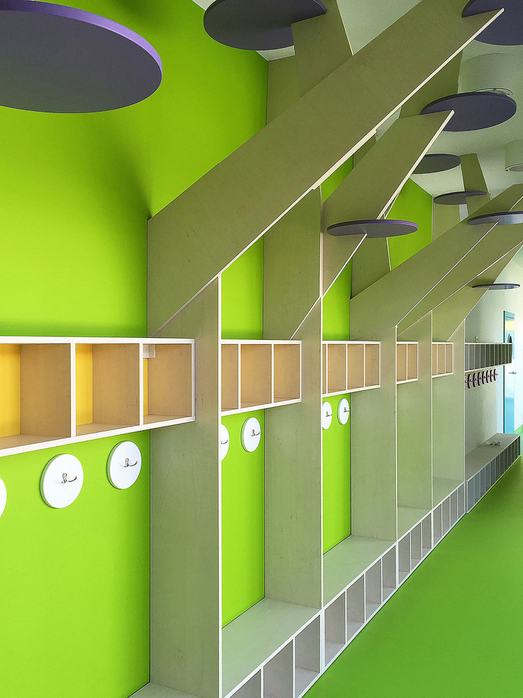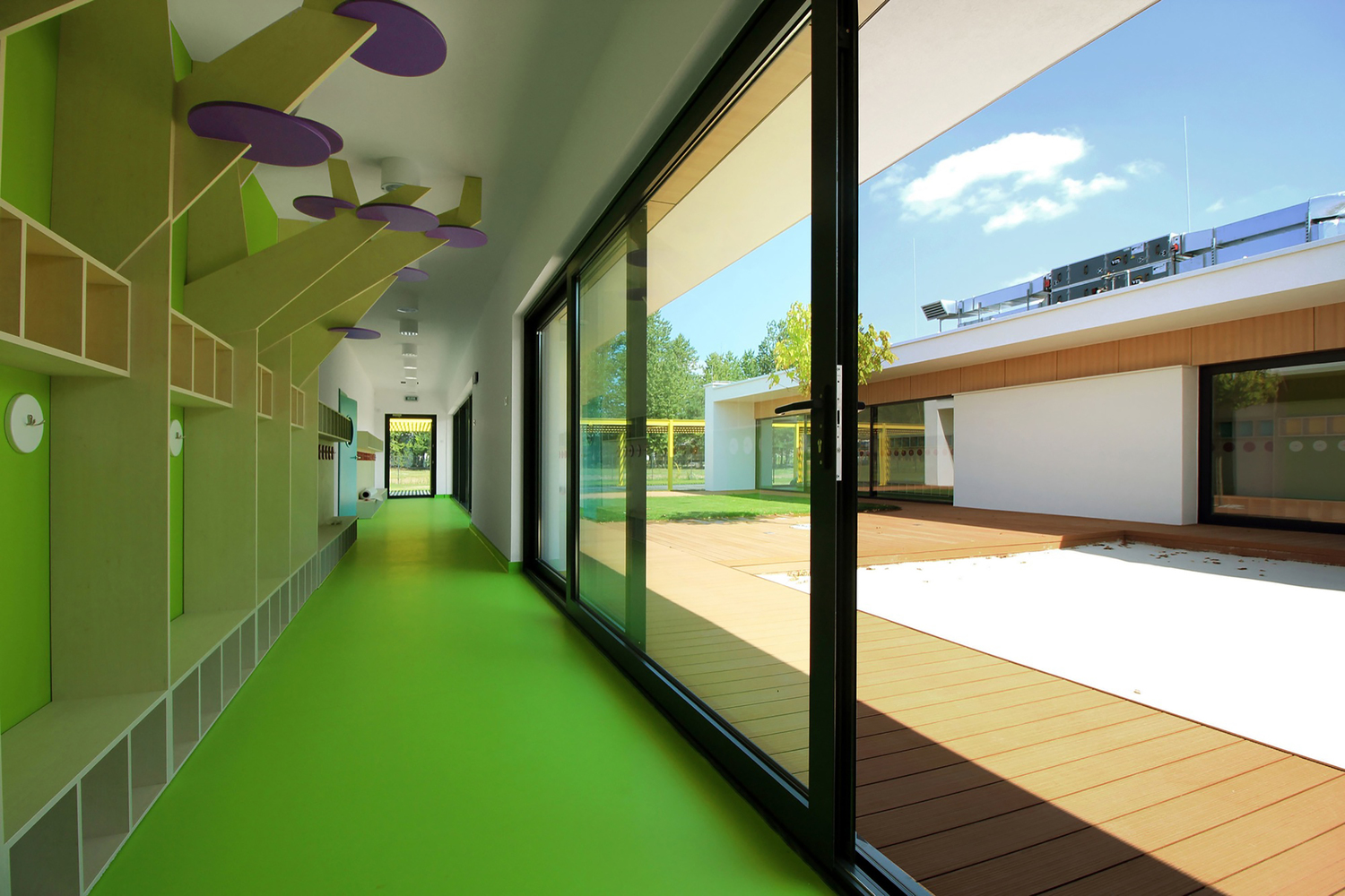 幼兒園是一層樓的設計,這個門廊般的建築體量中有五個房間,兩間為托兒所準備,剩下三間為幼兒園所用。項目可以容納125個孩子。項目單斜麵的屋頂使用的是膠合層壓的木結構。內部庭院中有沙坑和樹,是“建築體量的核心”。庭院處的牆壁上有一扇大窗戶向中庭敞開,這帶來了最大限度的自然光線。衣帽間和教室直接的聯係著。衣帽間中的窗戶可以滑動打開,以便於孩子們以盡可能短的方式達到花園。玻璃的走廊和低的屋頂是庭院的通道。它們模糊了內外部空間之間的界限。